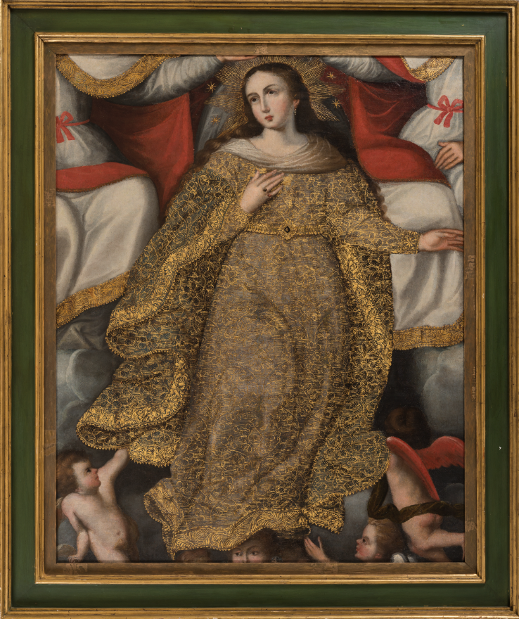 De estar completa, en esta pintura se observaría a la Trinidad (representada individualmente por el Padre, el Hijo y el Espíritu Santo) otorgándole a María la corona que la identifica como reina de todo lo creado. Sin embargo, al estar recortada, solo se observan parte de los cuerpos del Padre y el Hijo quienes reposan sobre nubes mientras extienden sus manos hacia la cabeza de la Virgen, que se encuentra ataviada con una túnica con ornamentos dorados y está sostenida por cuatro ángeles.
