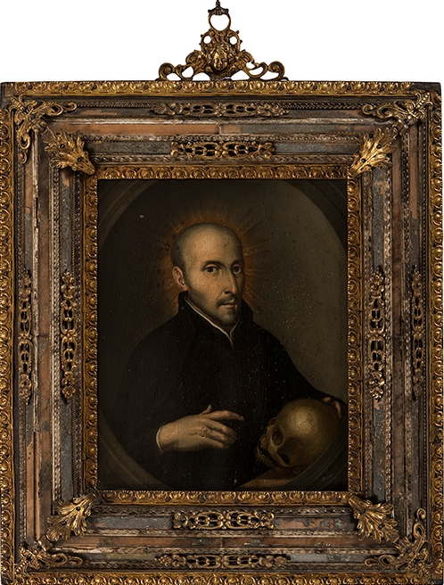Después del fallecimiento de su esposa, Leonor de Castro, acaecido en 1546, Francisco de Borja se ordenó como religioso de la Compañía de Jesús, donde fue misionero y apoyó la construcción de colegios y conventos para religiosos. En 1565 fue nombrado general de la orden, cargo que desempeñó hasta su muerte. Al santo, canonizado en 1671 por Clemente X, se le representa con la vestidura negra de los jesuitas y portando el cráneo, símbolo de la vanidad y el abandono de las riquezas. Así se le observa en esta pintura atribuida a Gregorio Vásquez de Arce y Ceballos.